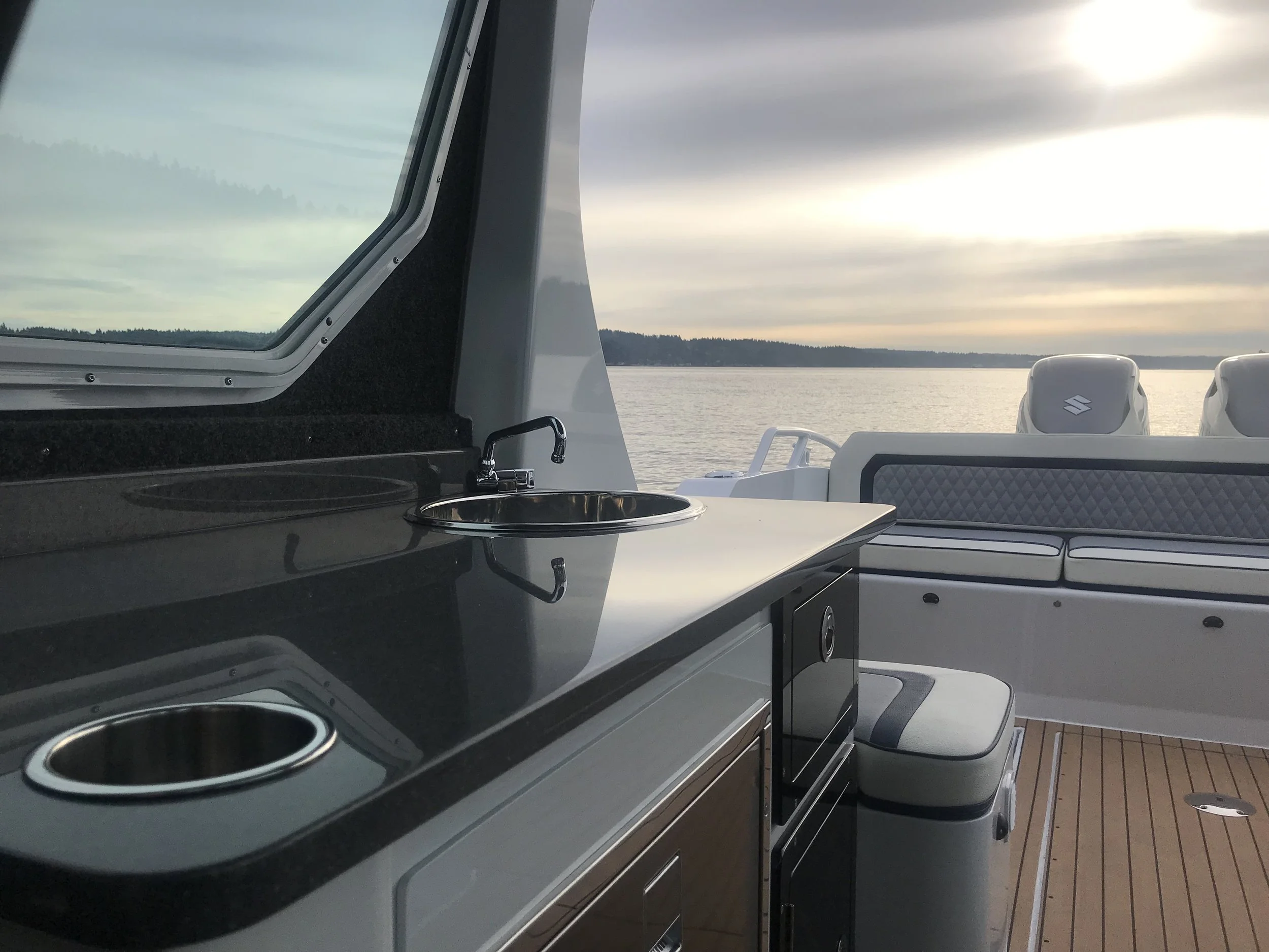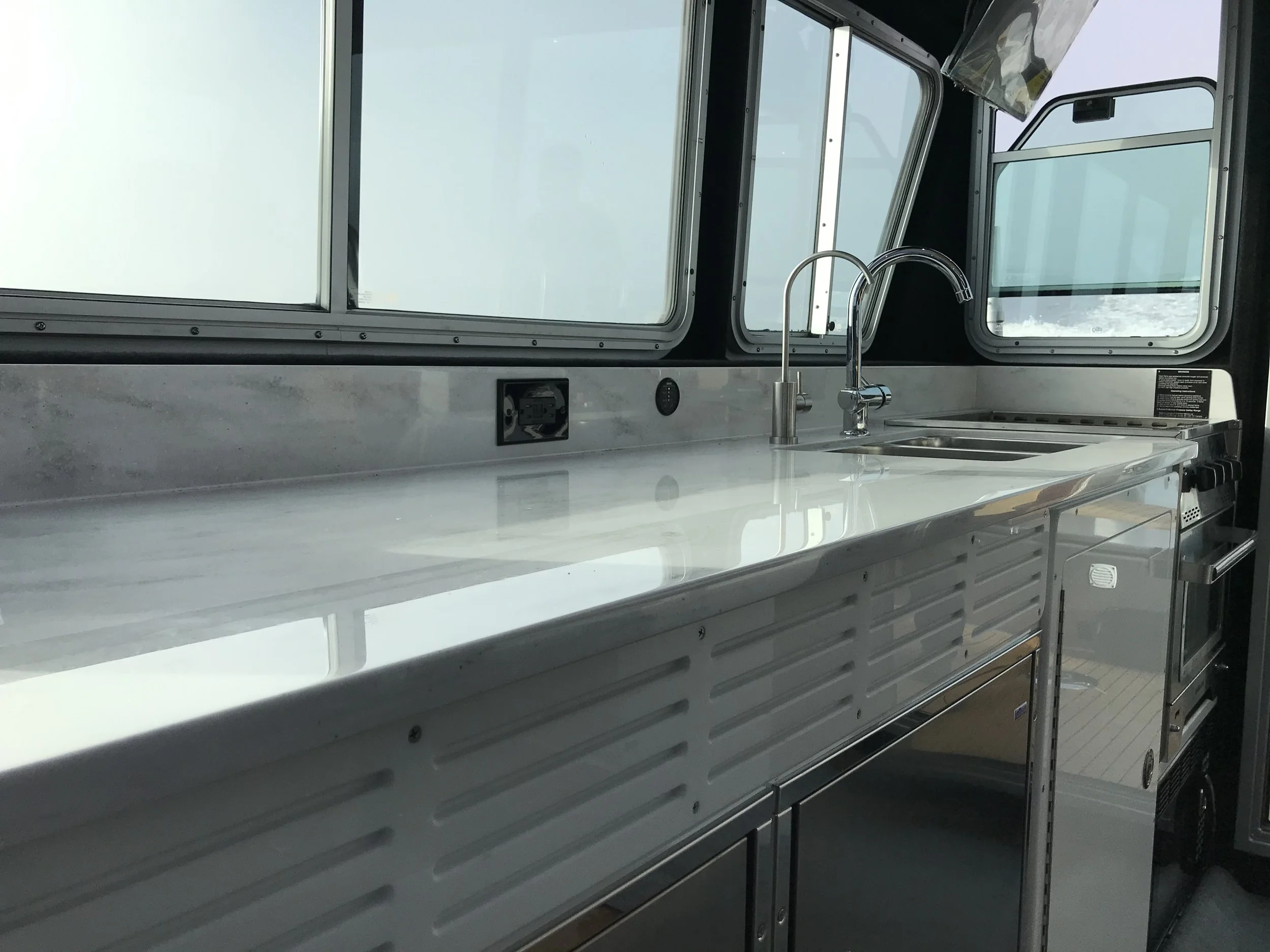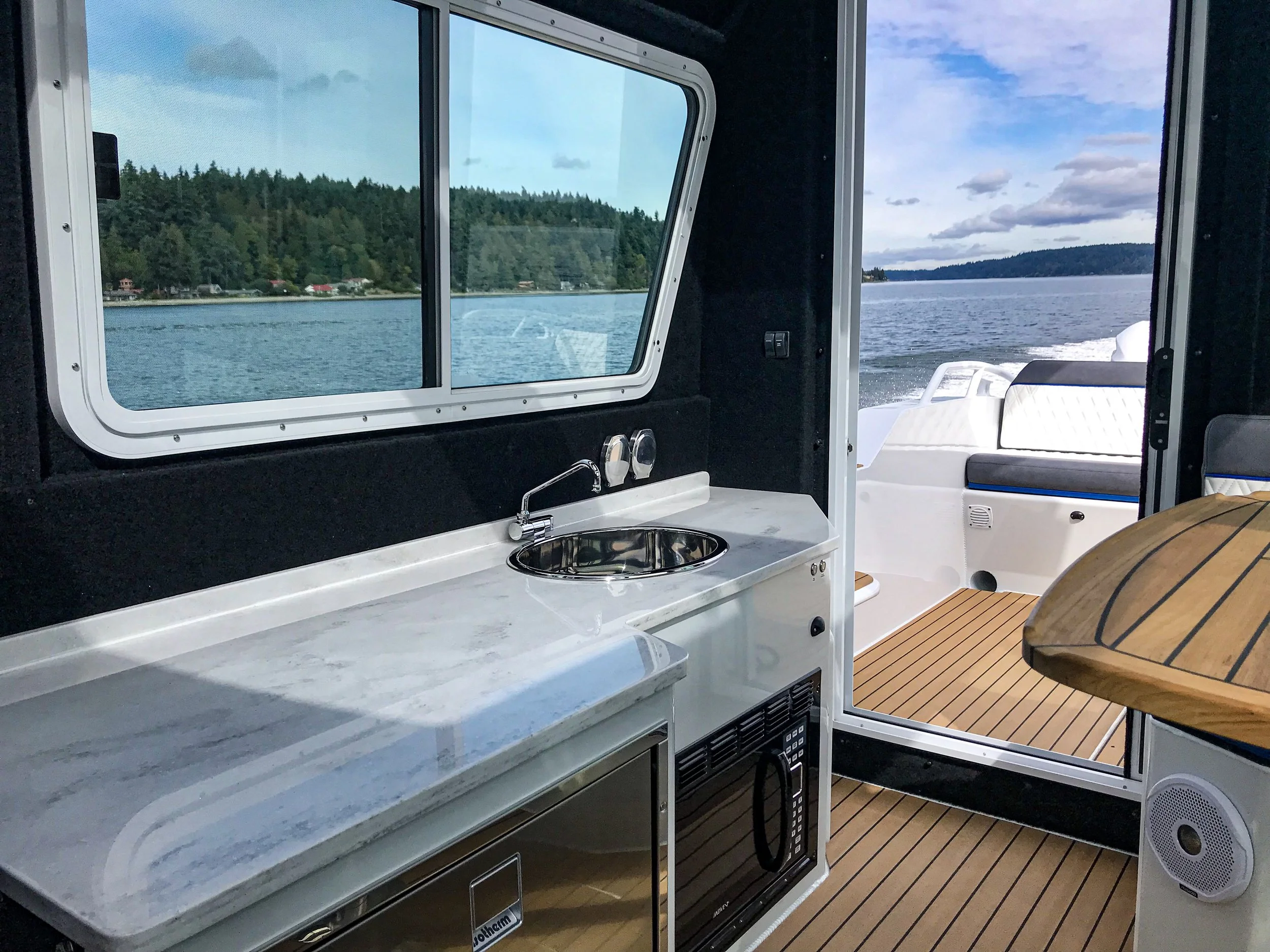 An increasing popular custom table option. An classy warm touch to your main cabin. Often these are selected