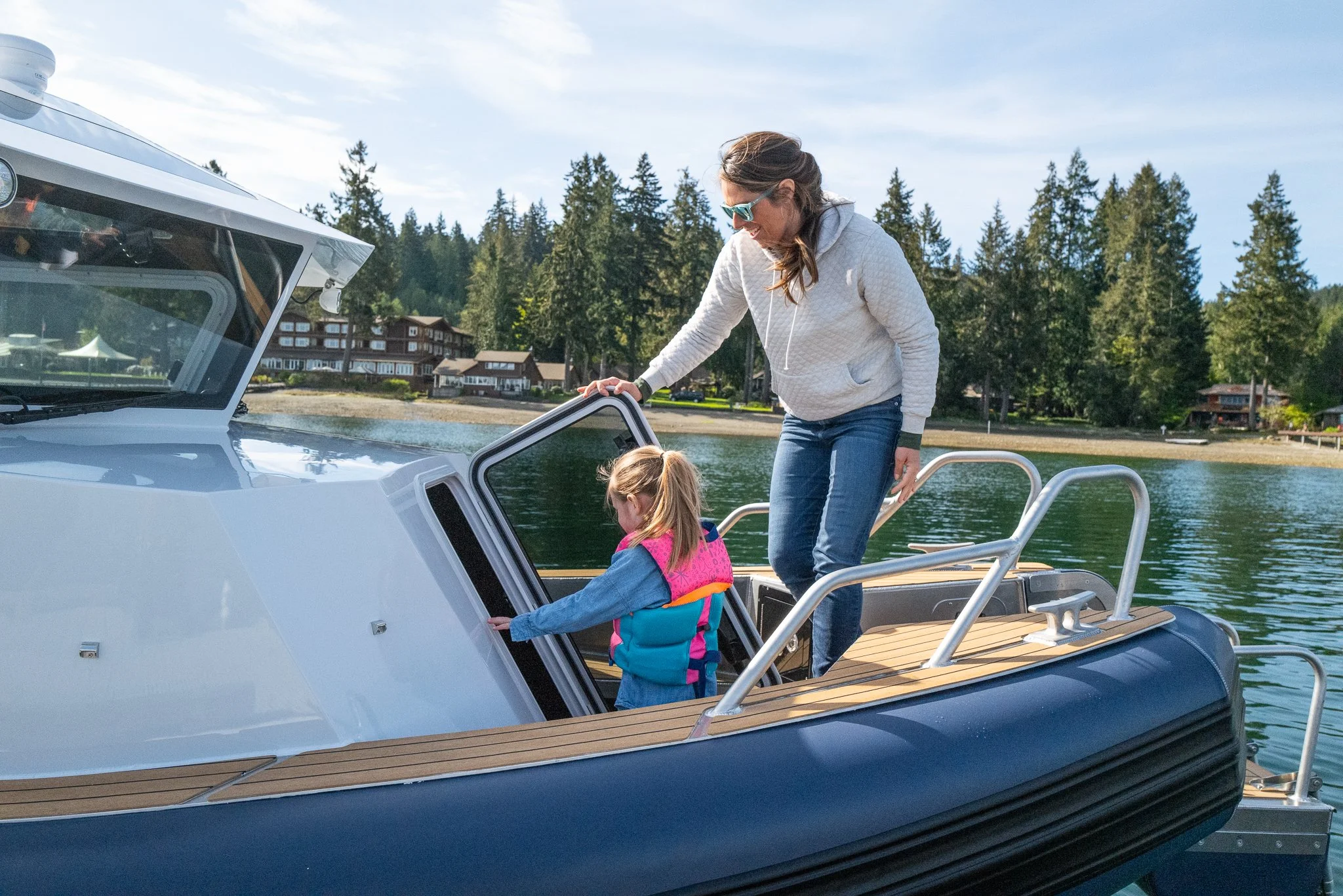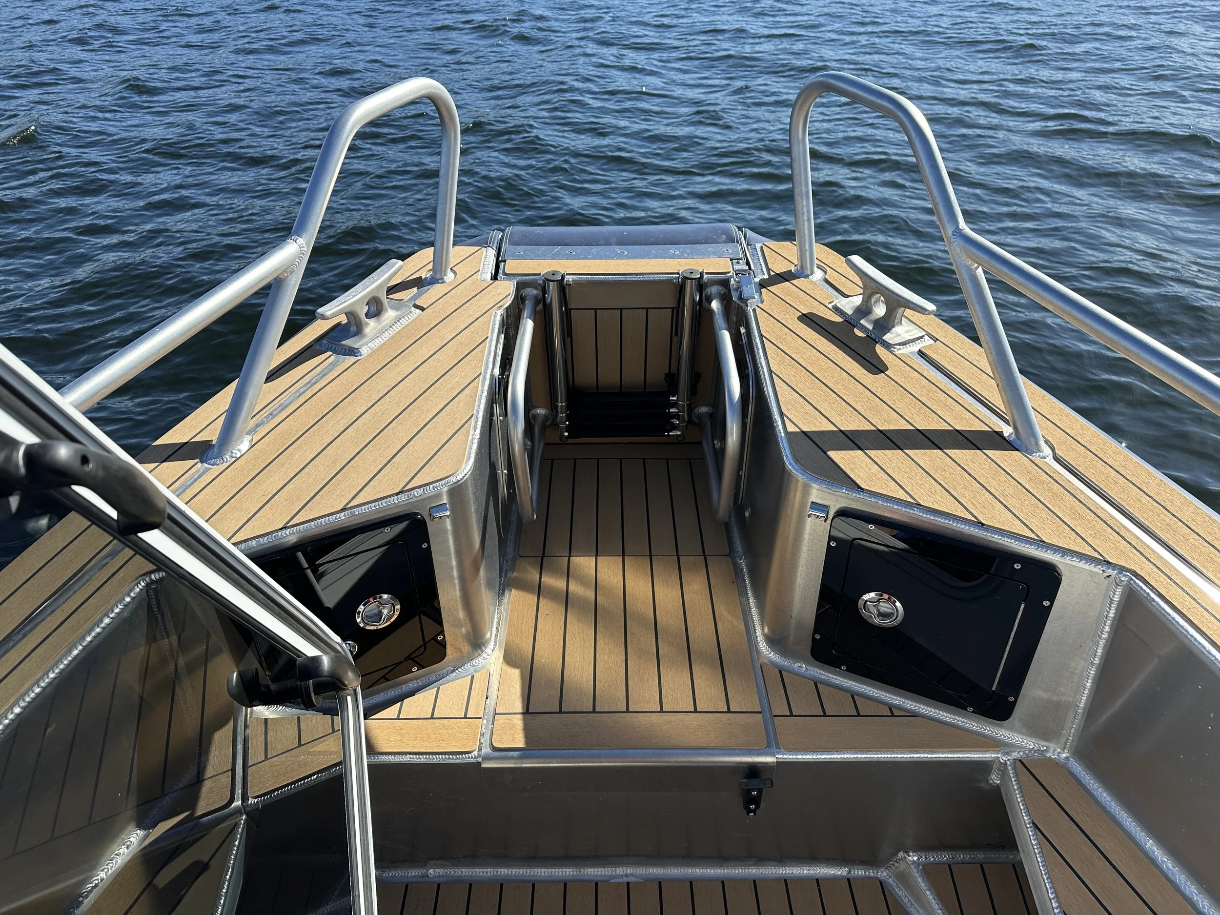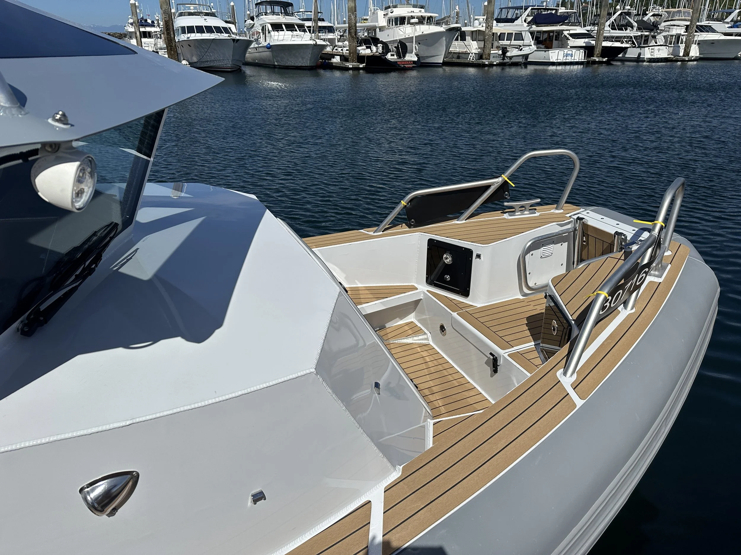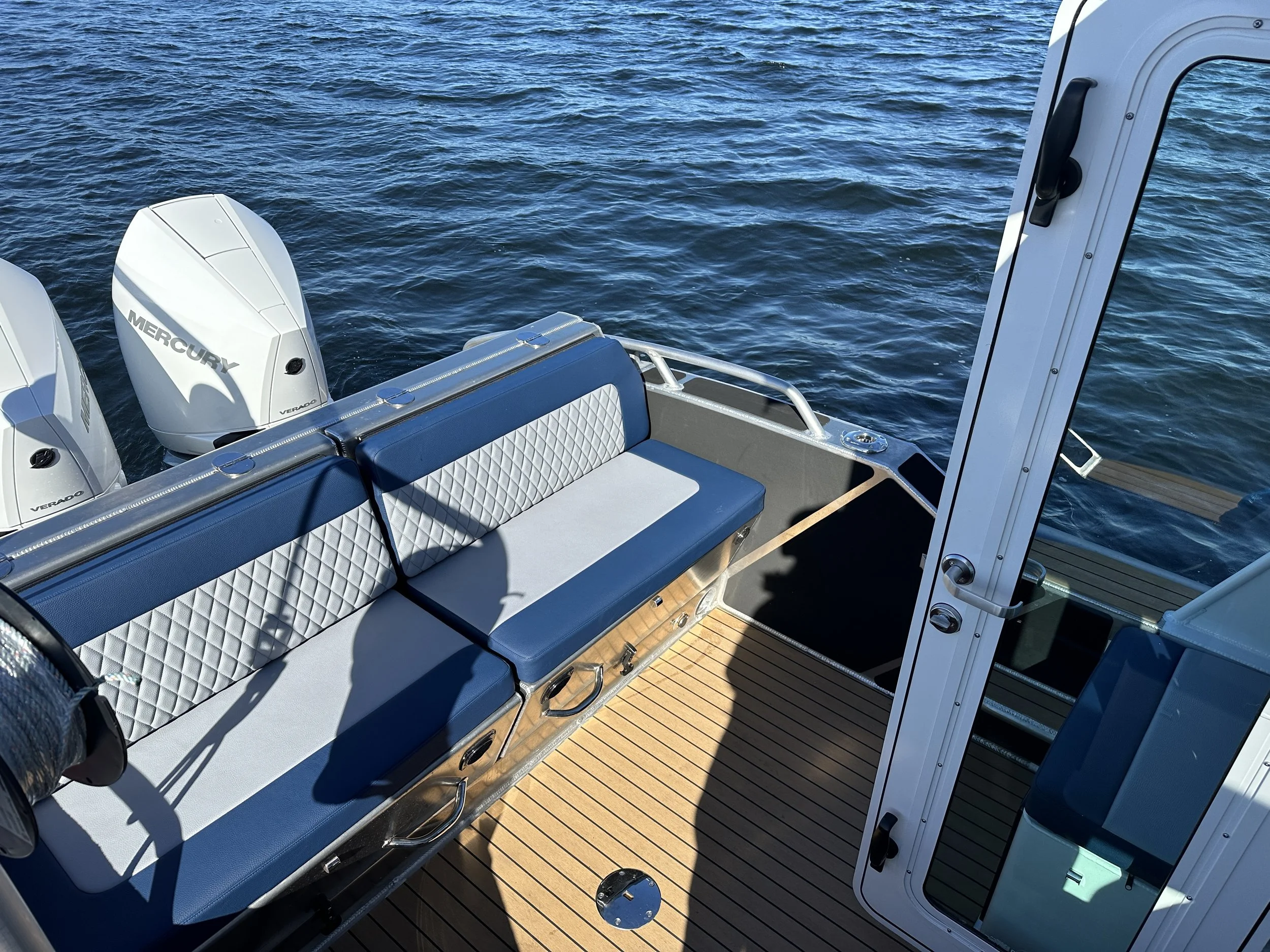Something you might notice on this boat is : it’s a hardback which is the less common option, as well it has a walkthrough though the back deck transom bench - which also is a less common option.