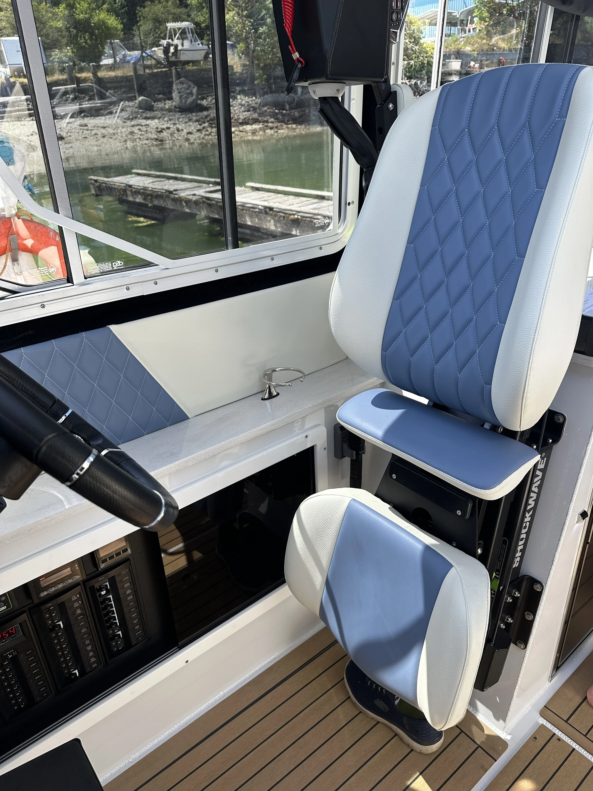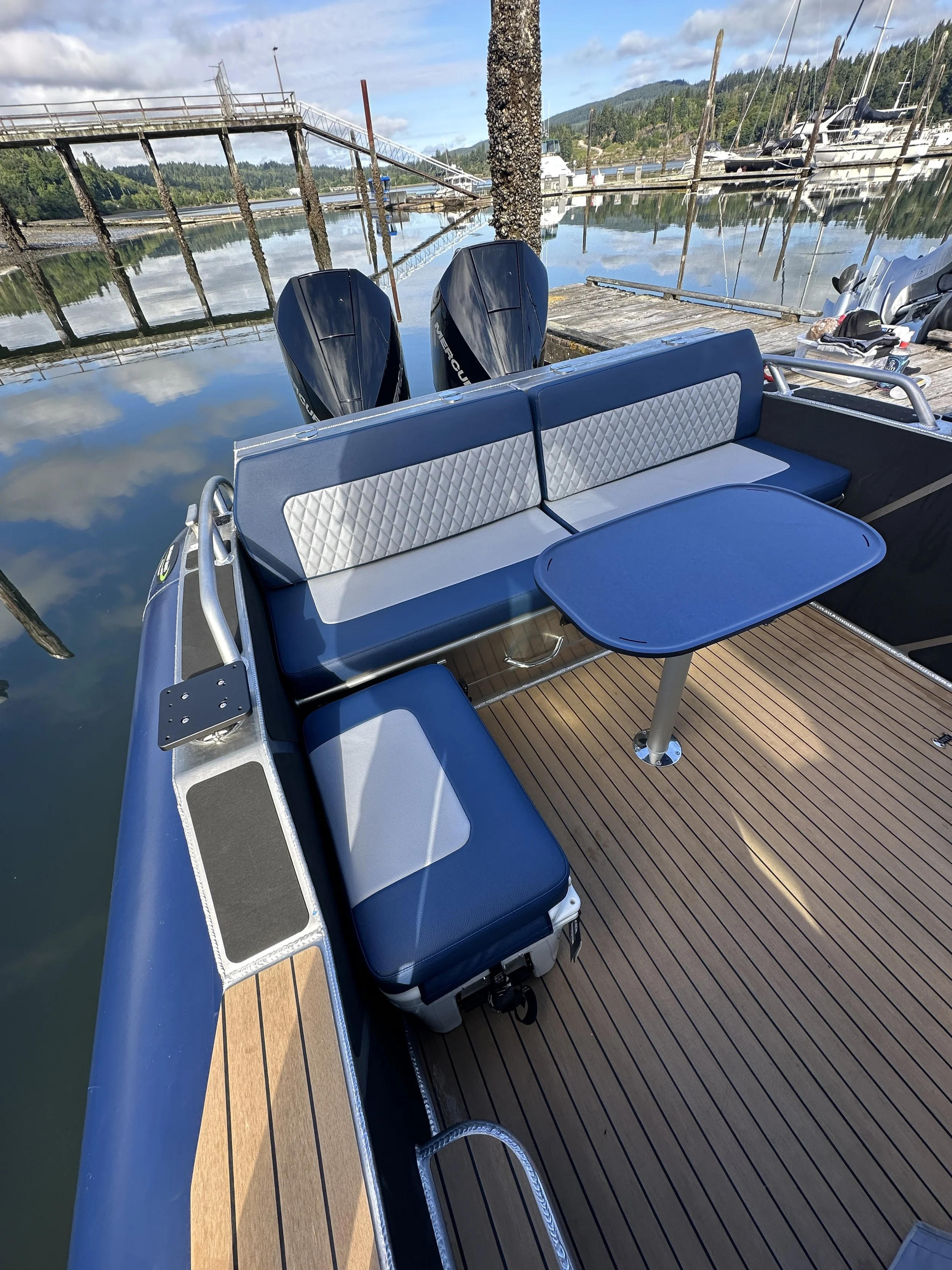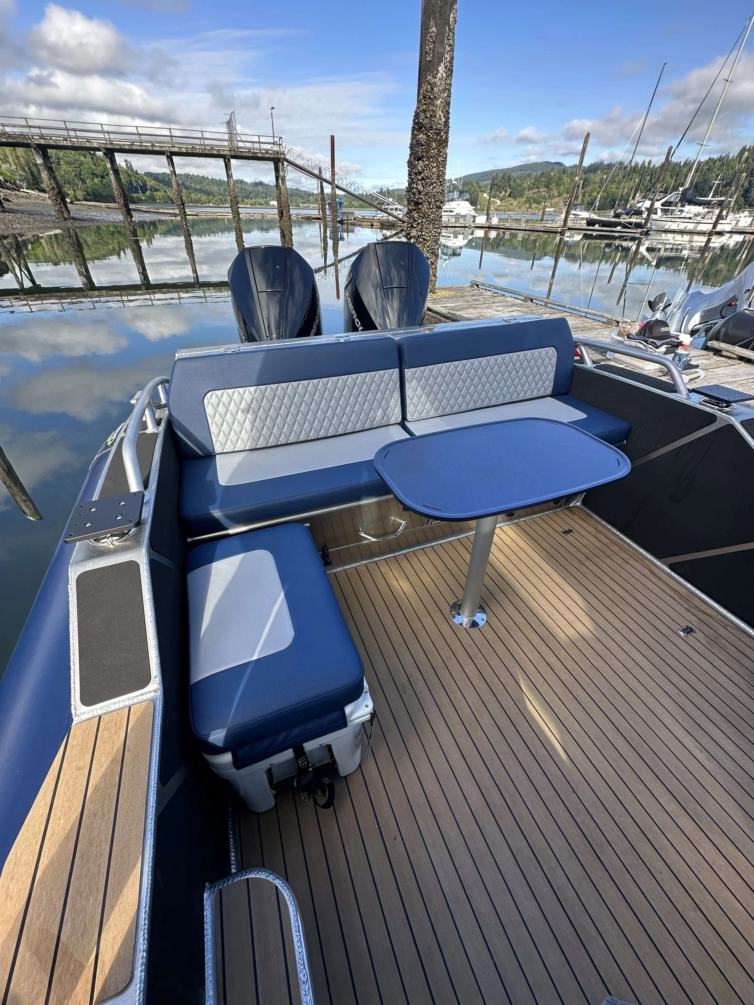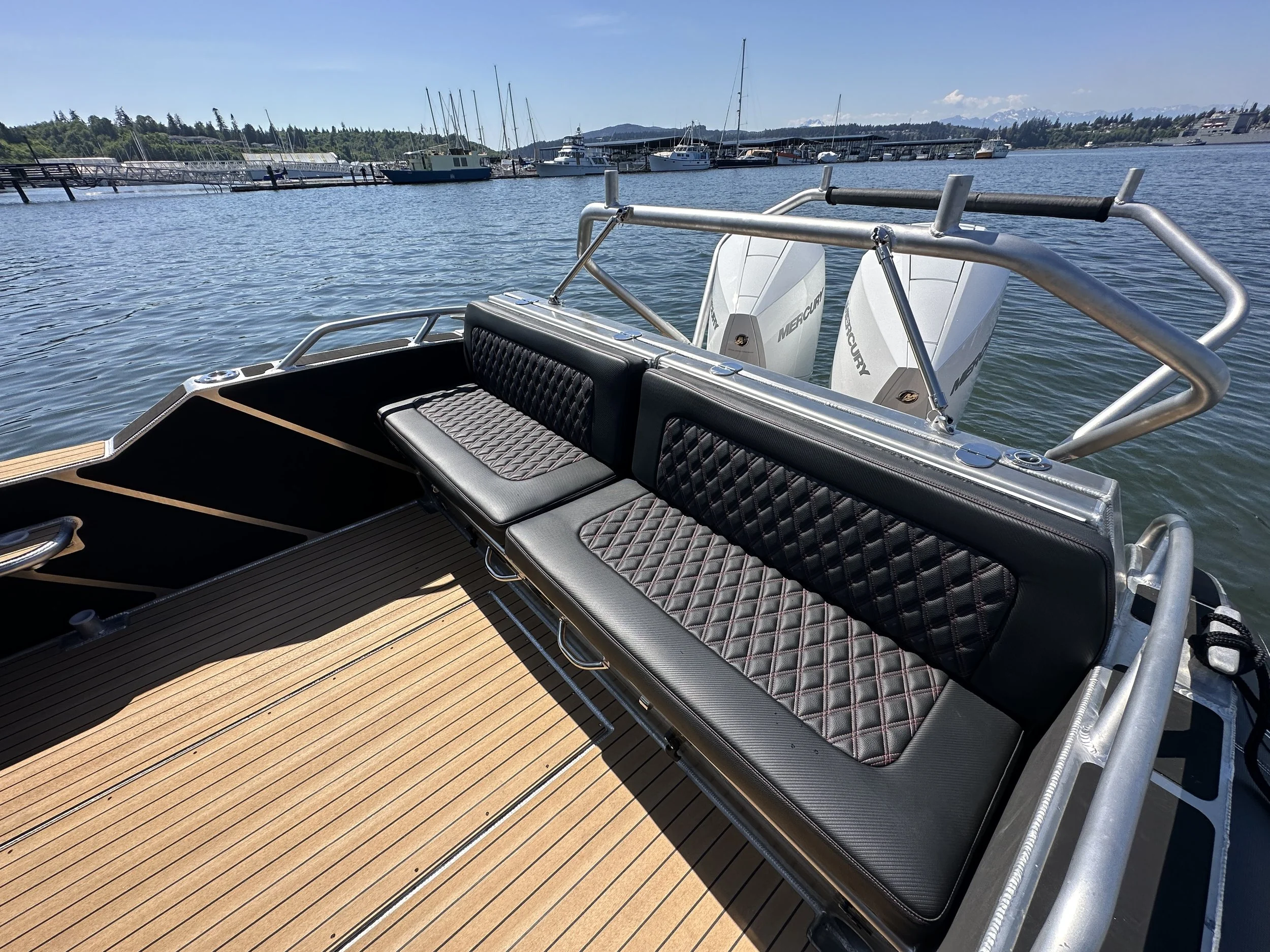 Pictured we have some great Blue and White upholstery. Also featured is our teak decking with an unpainted aluminum body.