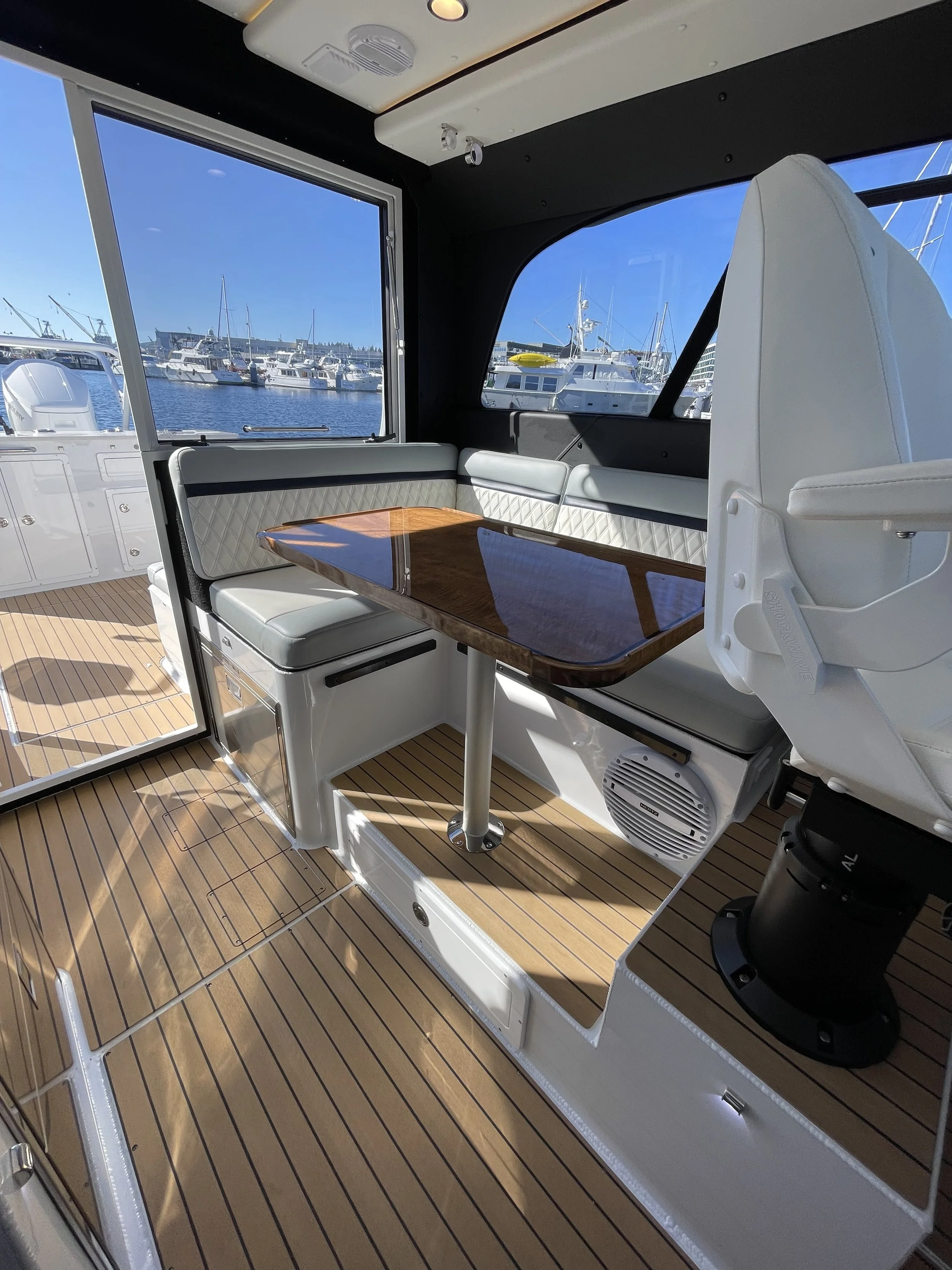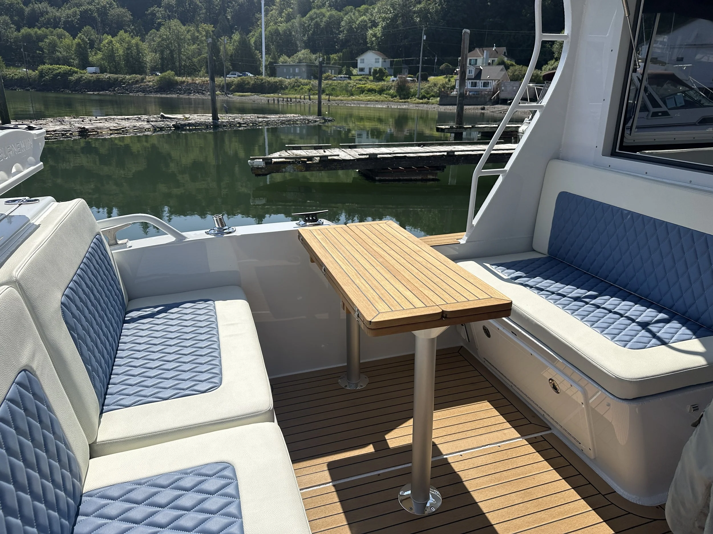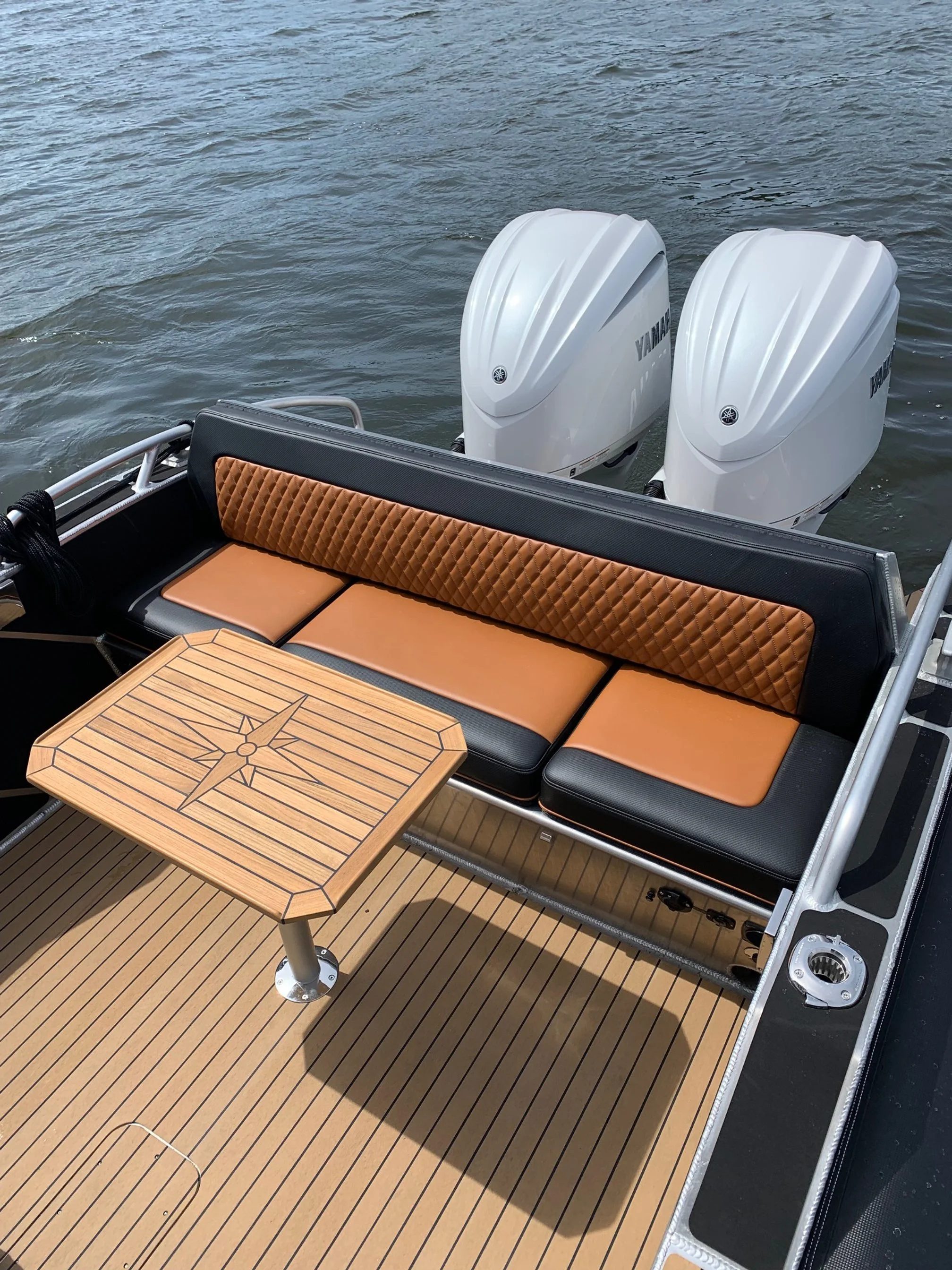 The aft deck on this vessel has an upholstery style we call Horseshoe, with Ochre as the primary color and ?