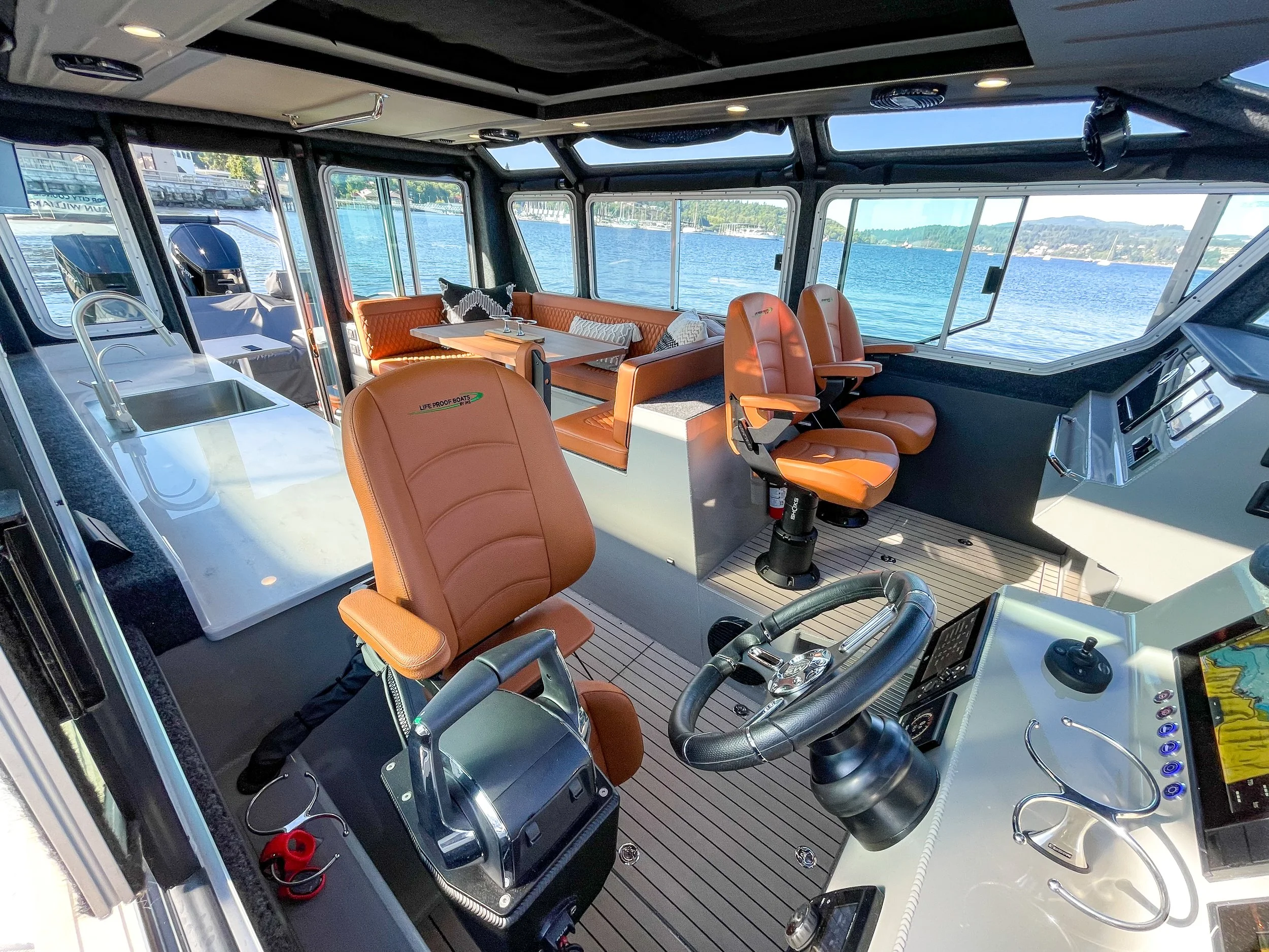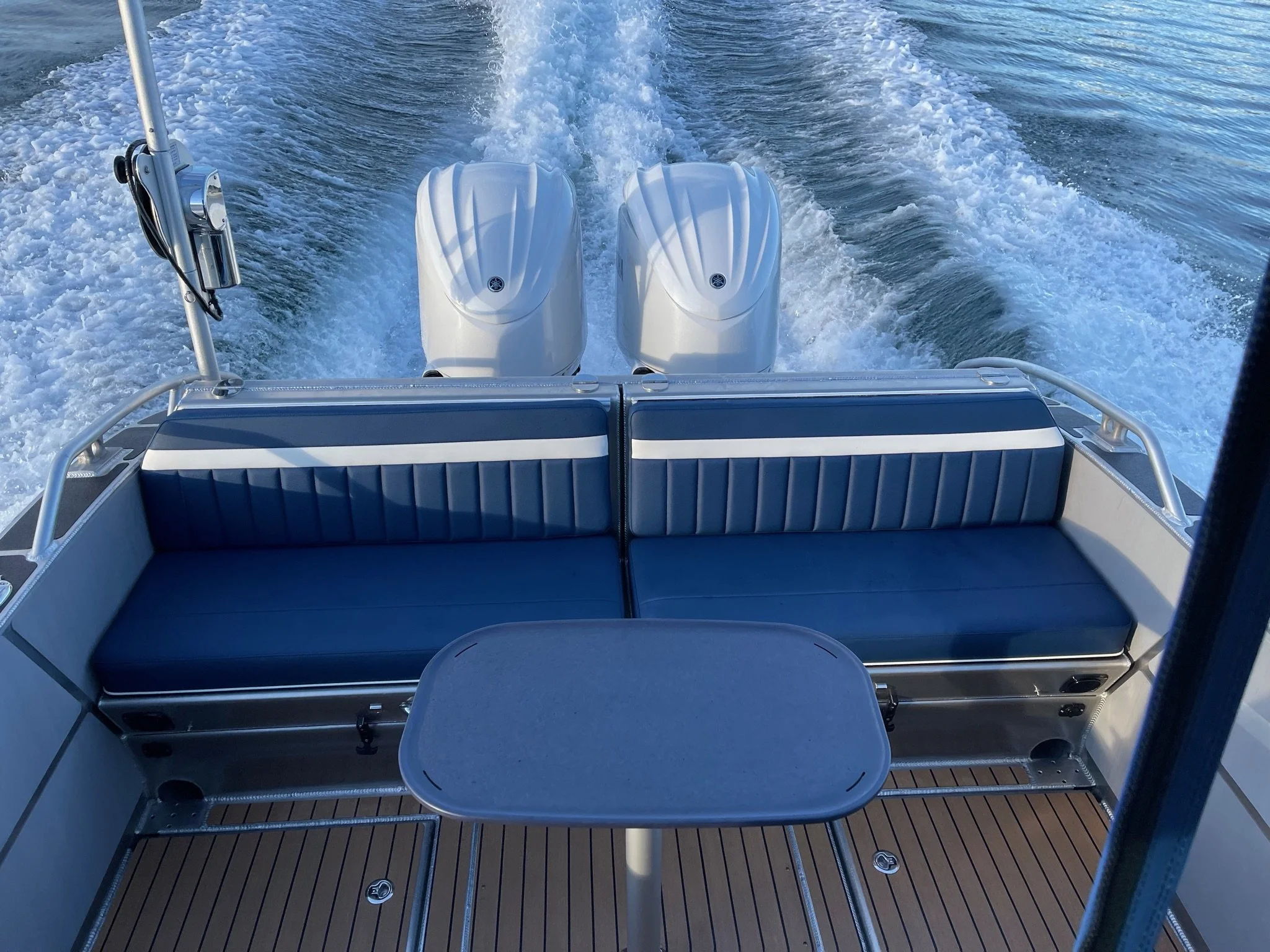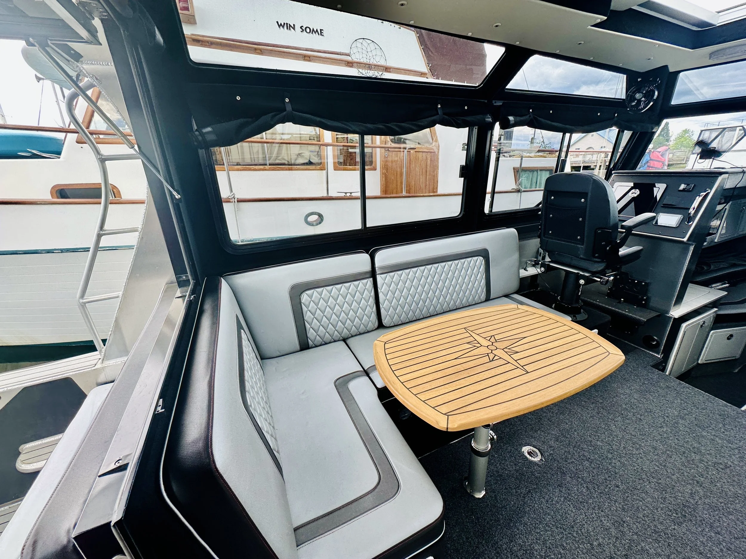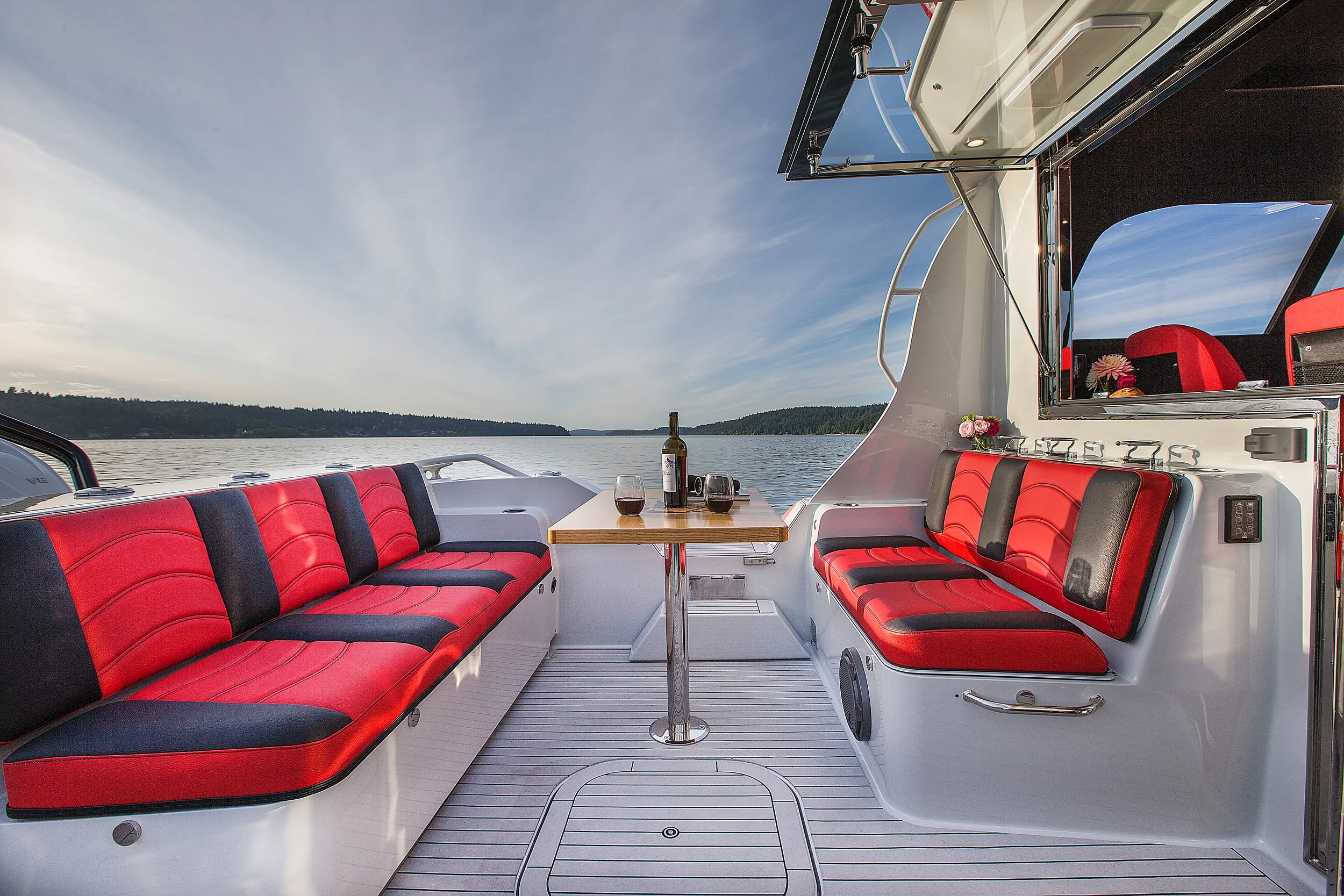 The aft deck on this vessel has an upholstery style we call Horseshoe, with Ochre as the primary color and ?