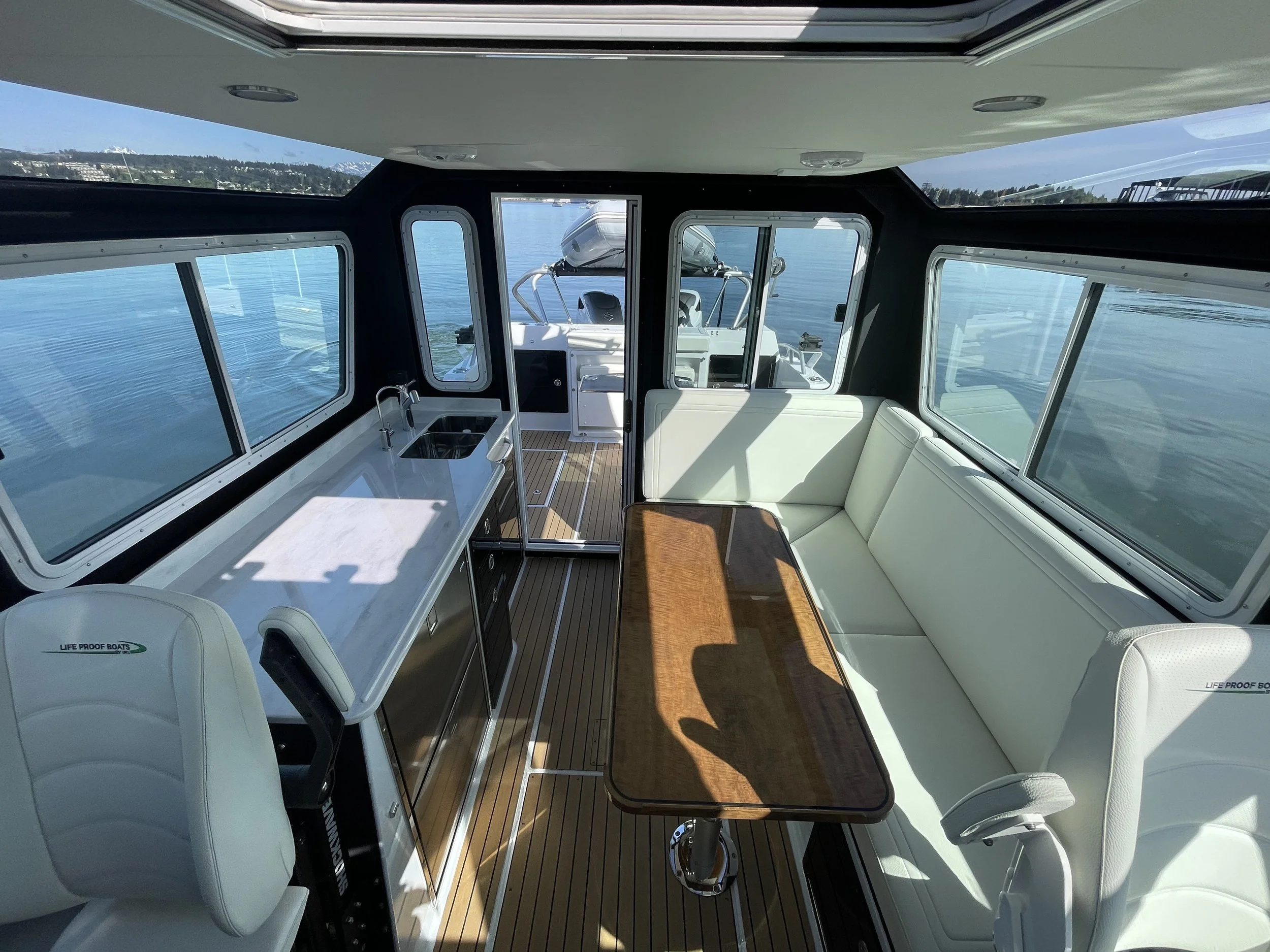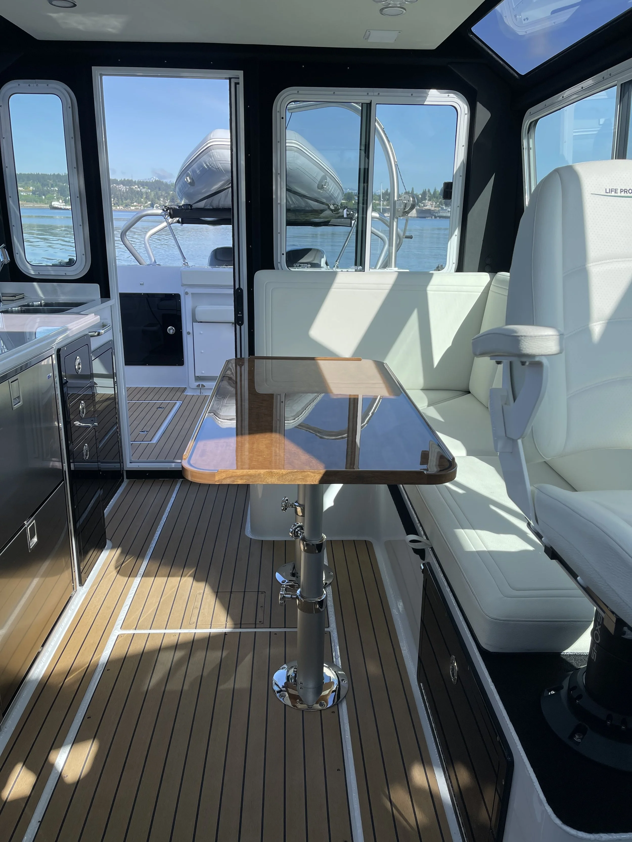 Single color white cuddy day bed, black hatches, teak decking, white interior paint.