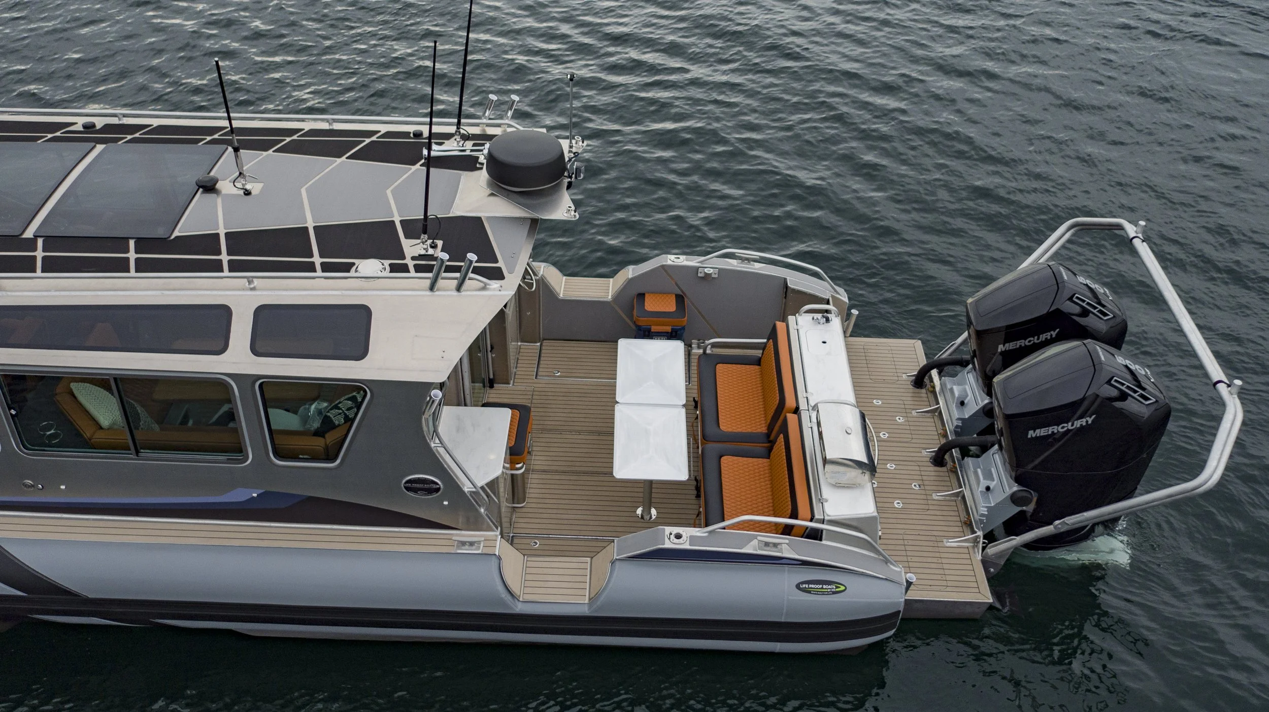 Here we have a single color Grey aft bench. Also in this image we have Black Rubberized Decking and an example of our aluminum exterior.