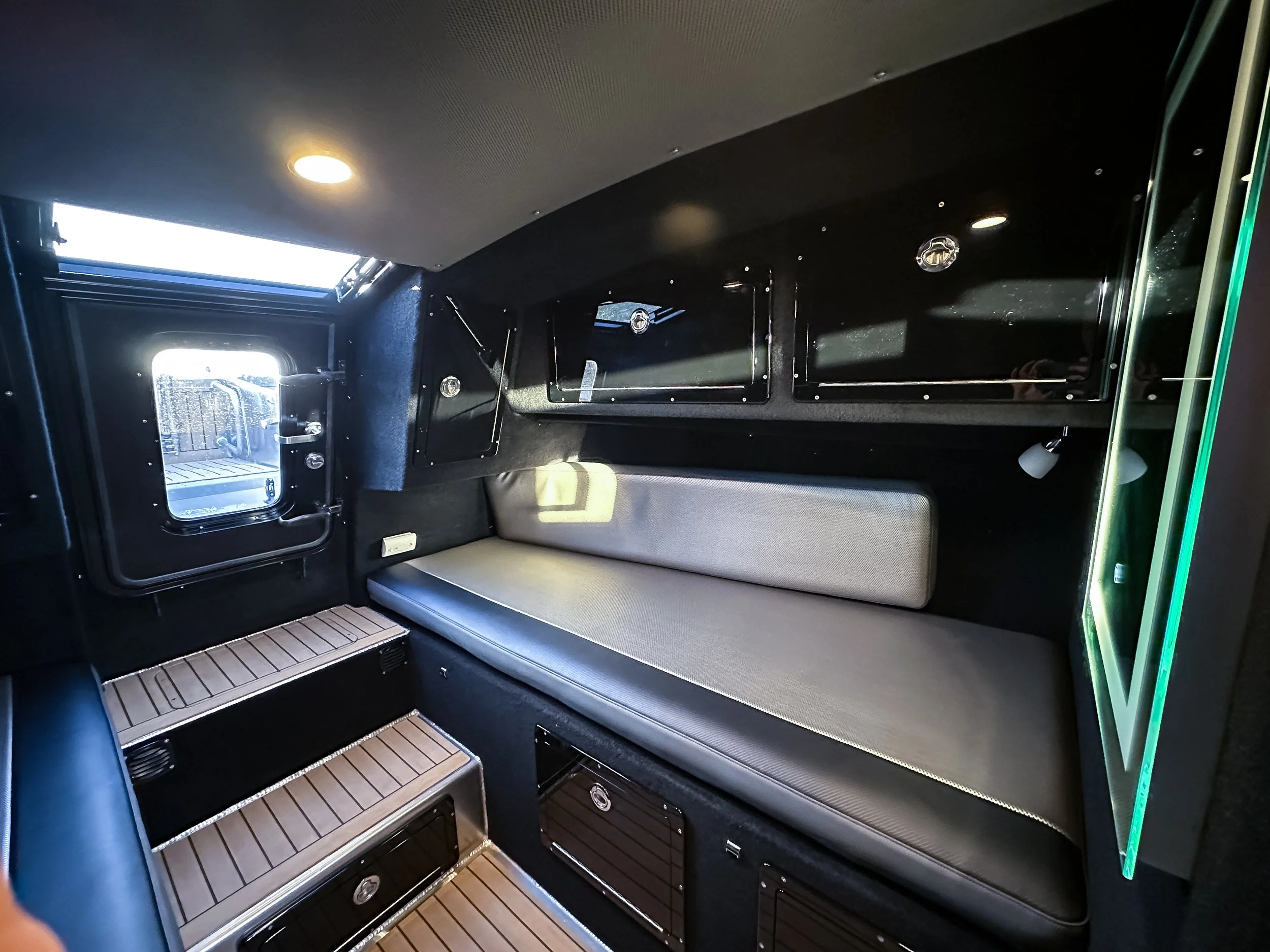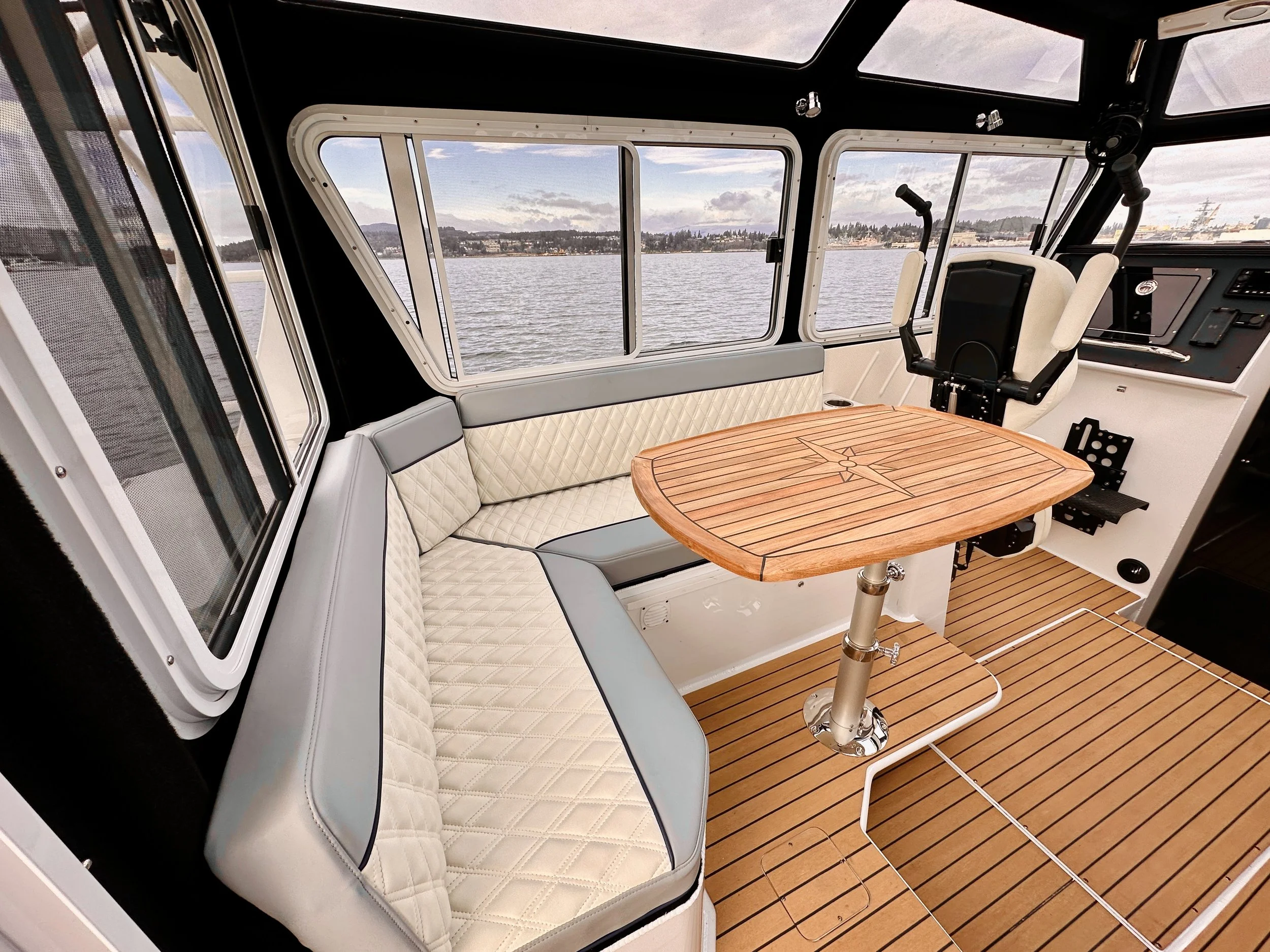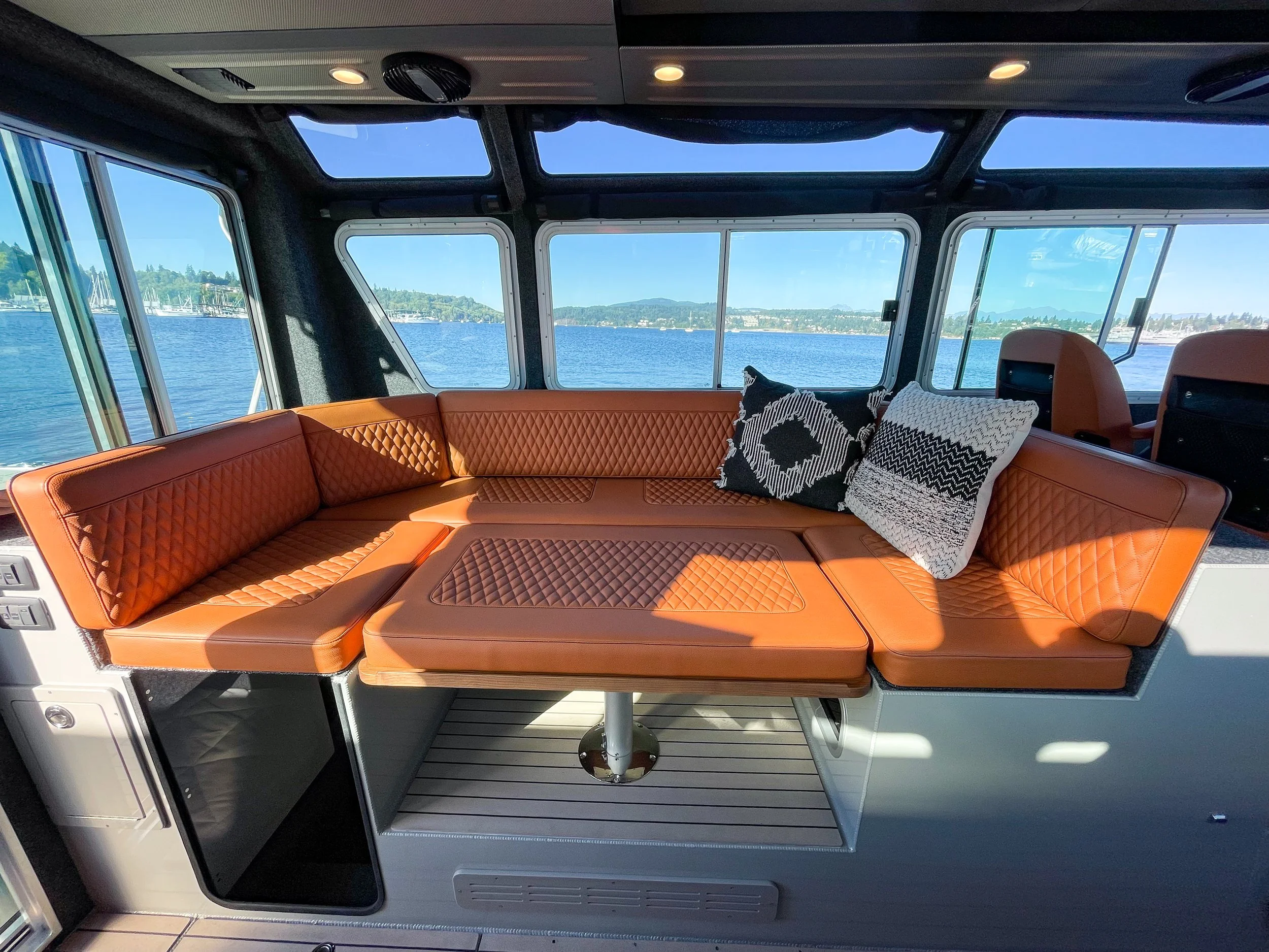 We have a U shaped salon bench in Ochre using our inhouse diamond pattern, it’s paired well with our suspension seats in Ochre. Also in this picture we have a Rain Cloud countertop, a painted white interior and teak decking.
