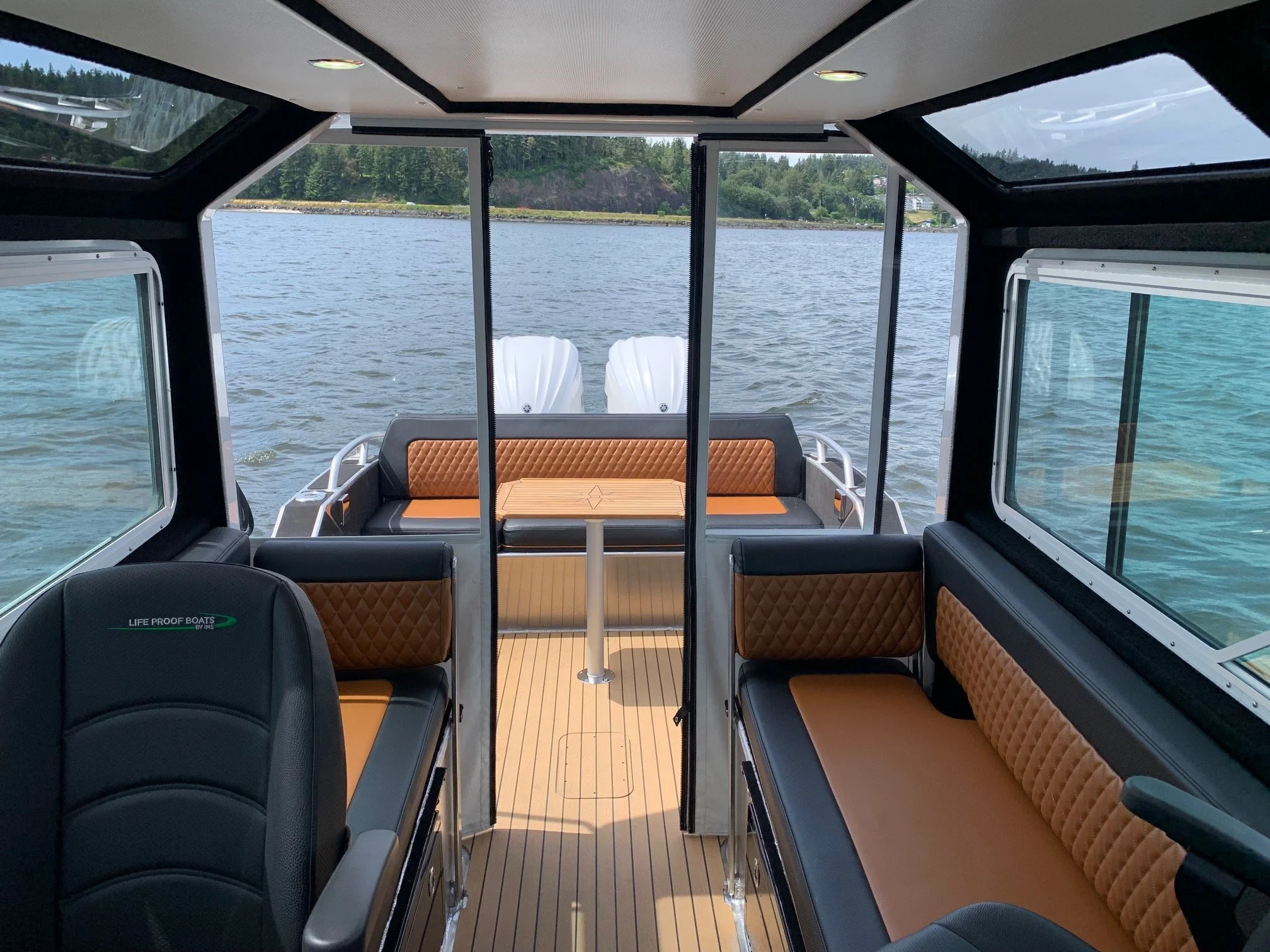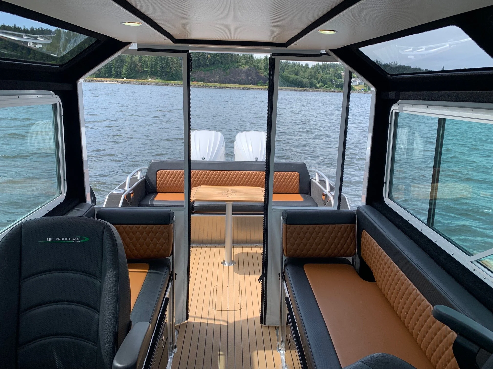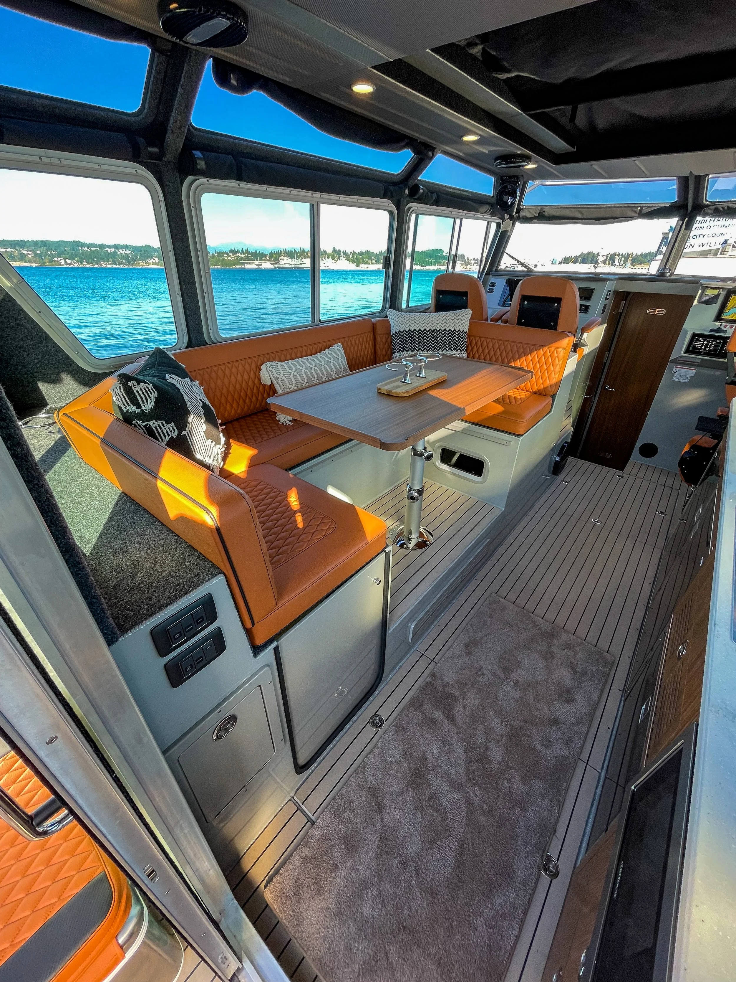 We have a U shaped salon bench in Ochre using our inhouse diamond pattern, it’s paired well with our suspension seats in Ochre. Also in this picture we have a Rain Cloud countertop, a painted white interior and teak decking.
