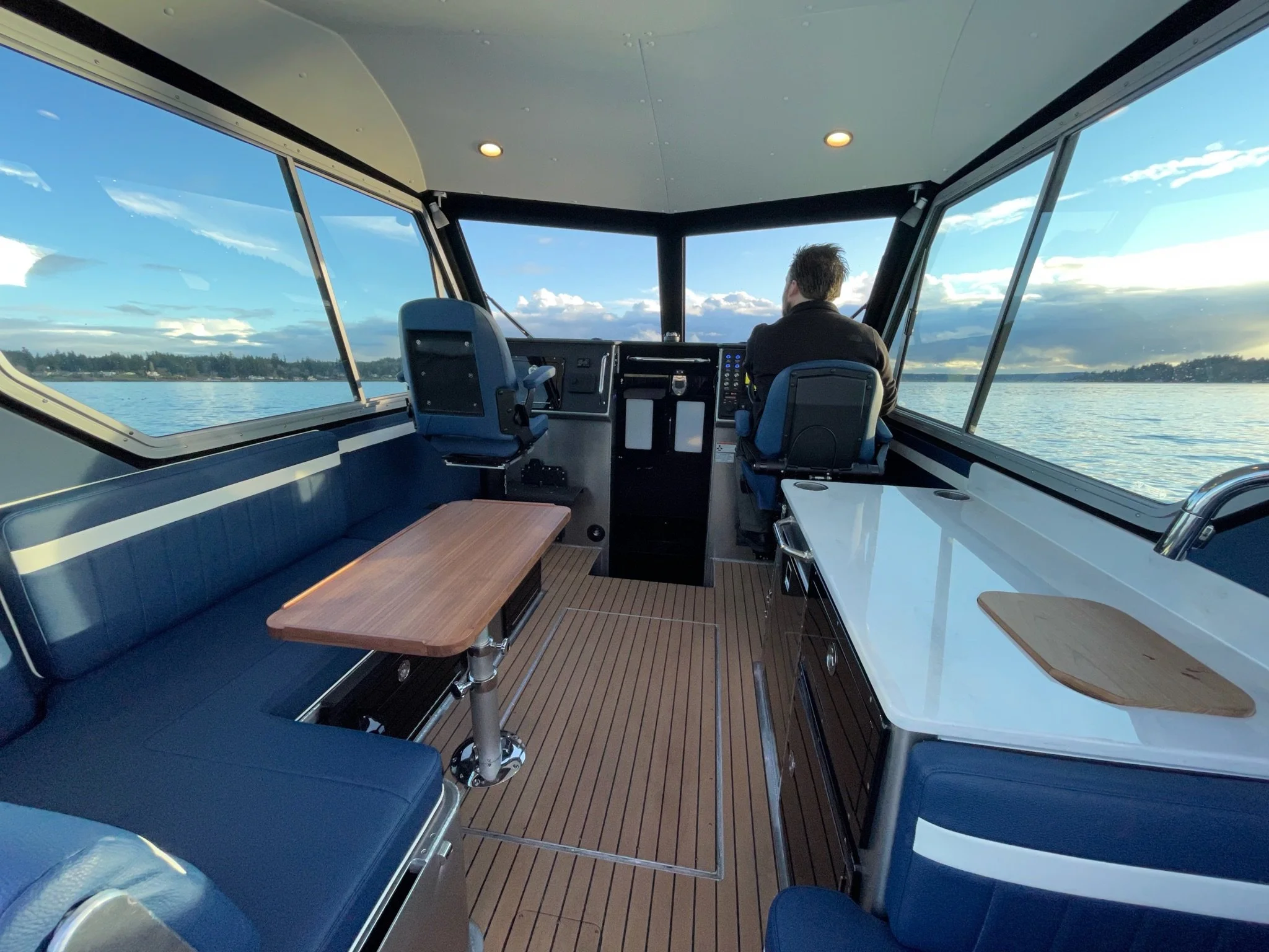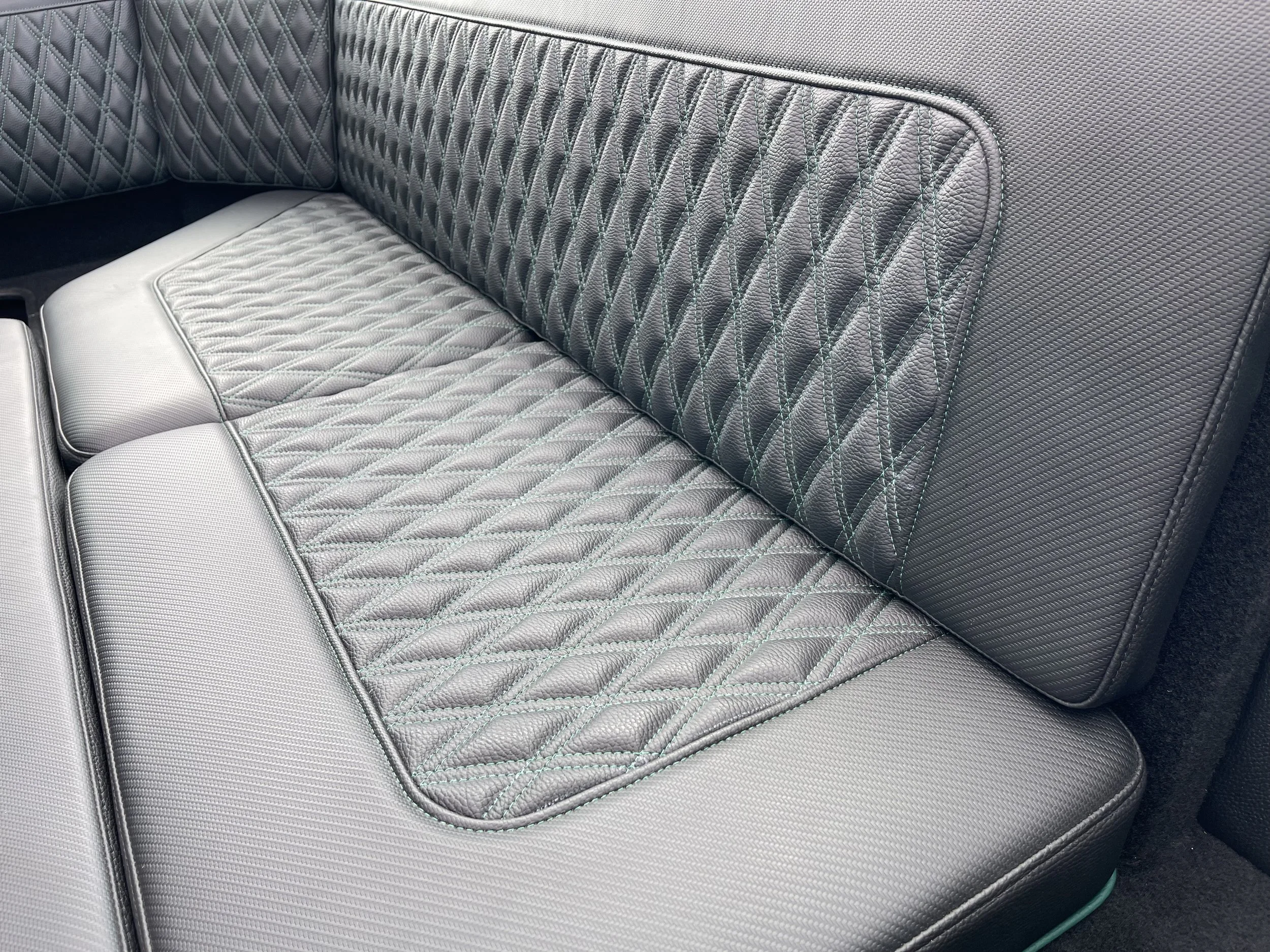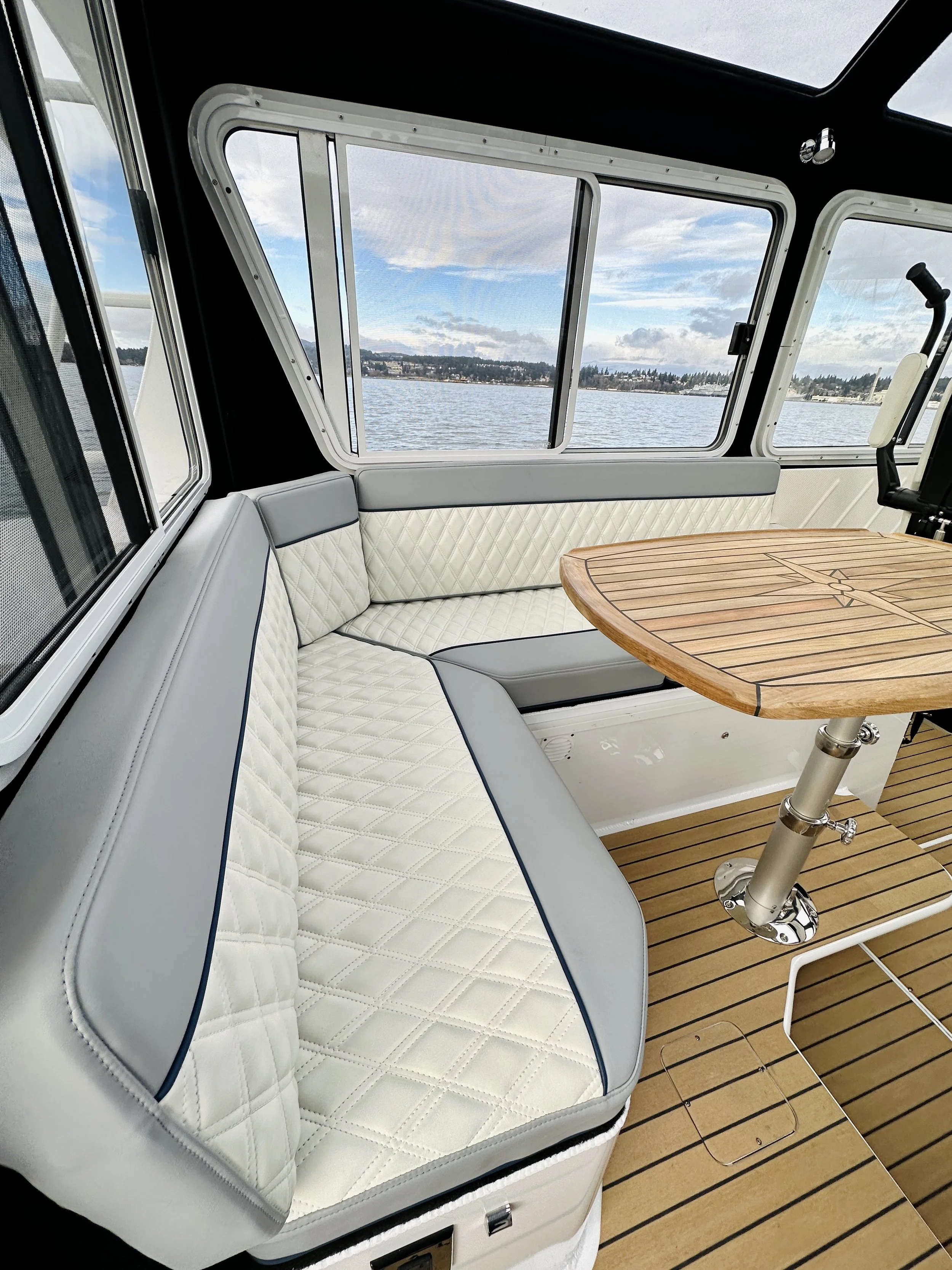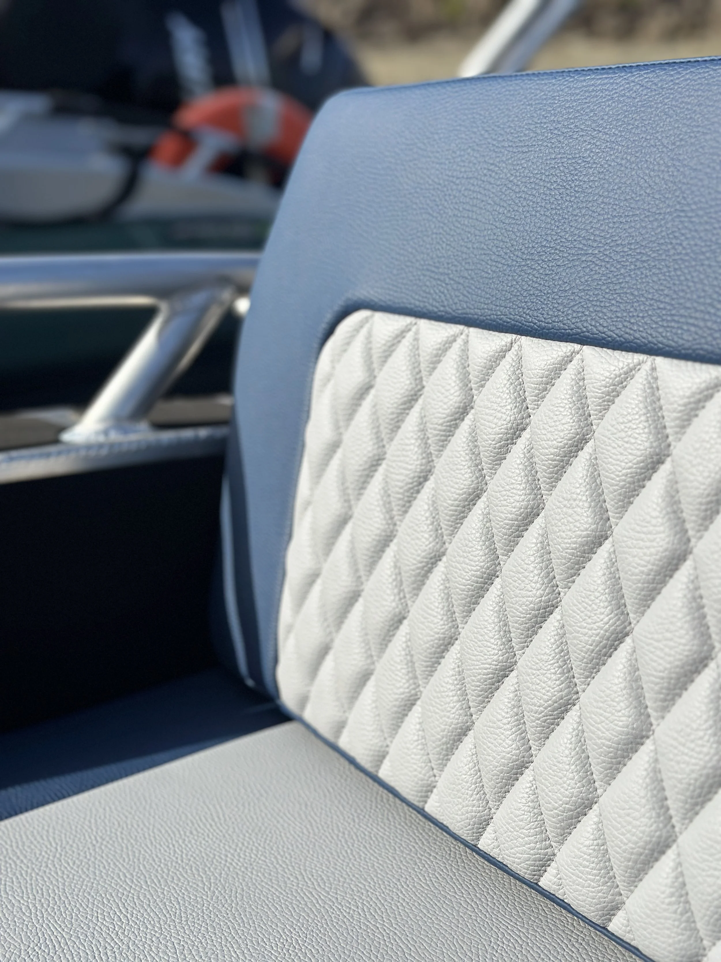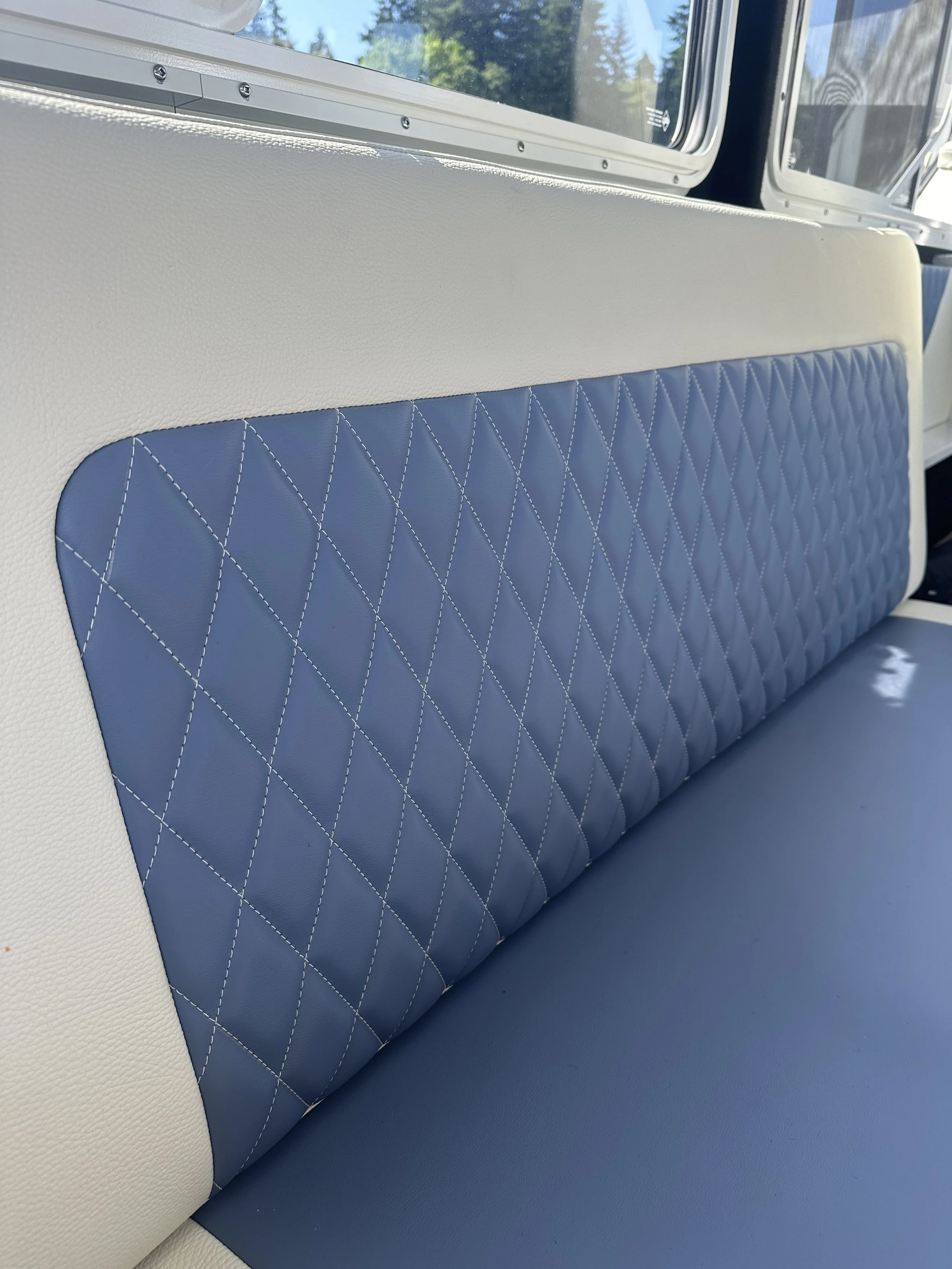 Here we have one color upholstery featuring our inhouse diamond pattern, this boat has white interior paint and teak decking.